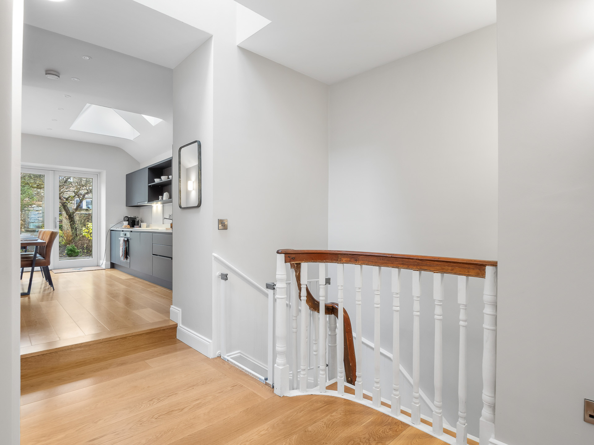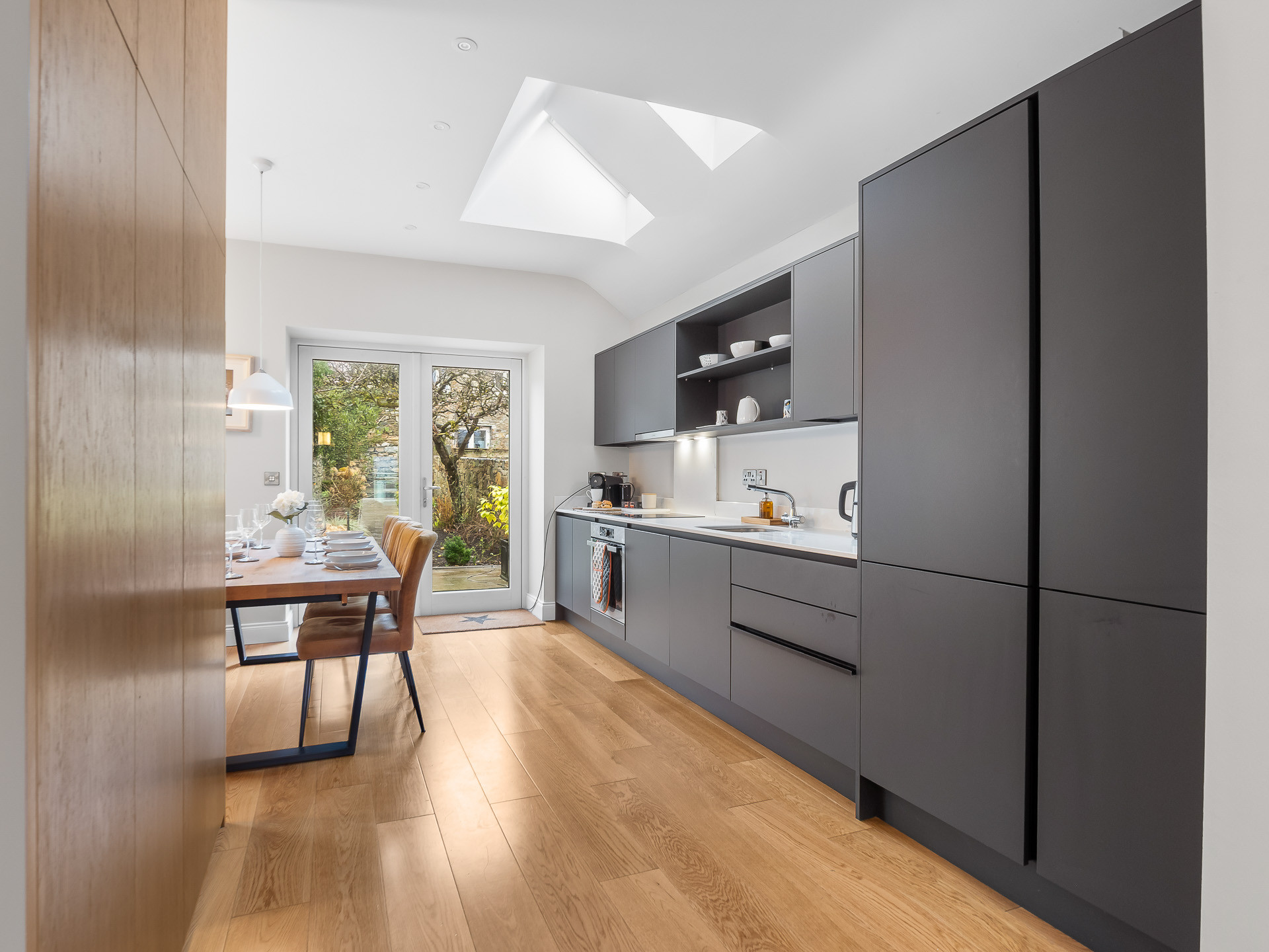 A modern, open-plan kitchen and dining area, fully equipped for your stay. Includes a coffee machine for your morning brew.