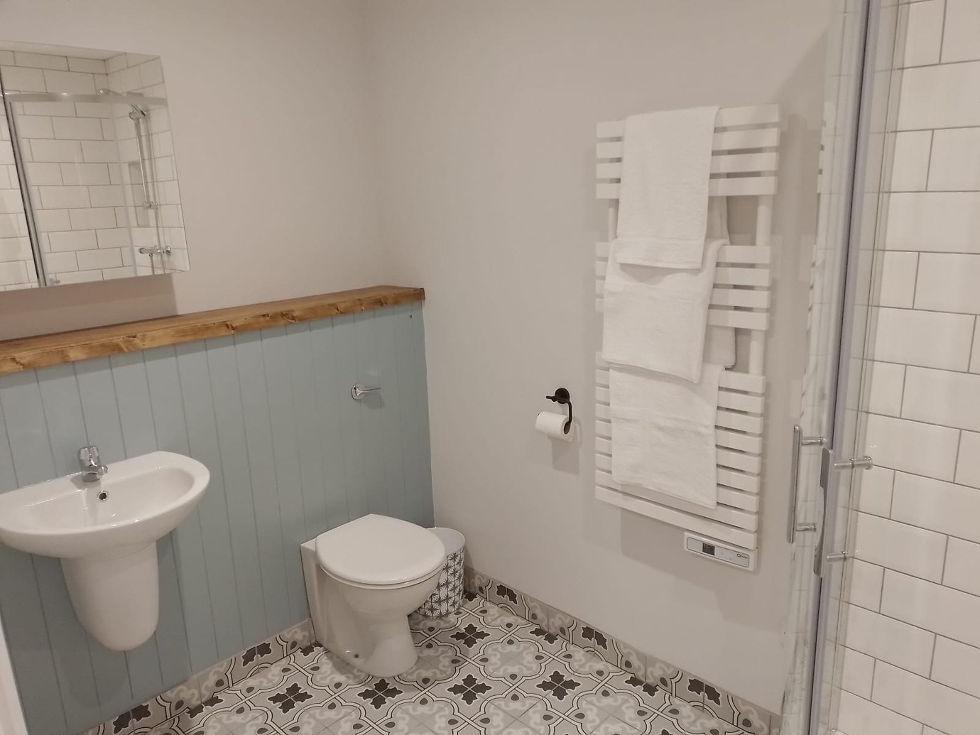 When it’s time to rest, retreat to the peaceful bedroom, which features a comfortable double bed and warm lighting. The sleek, modern bathroom includes a refreshing walk-in shower.