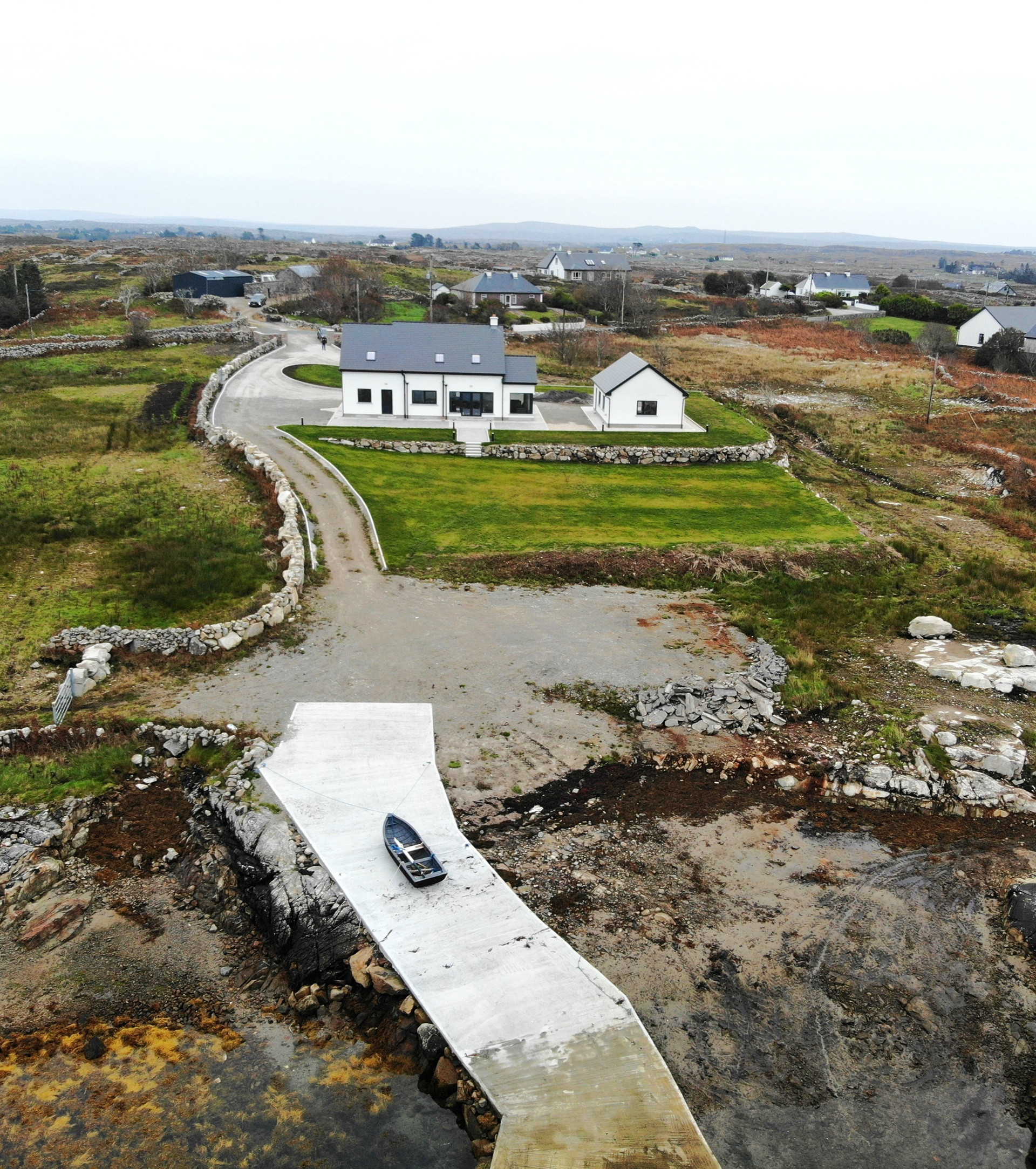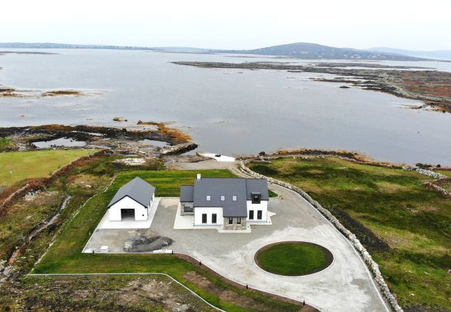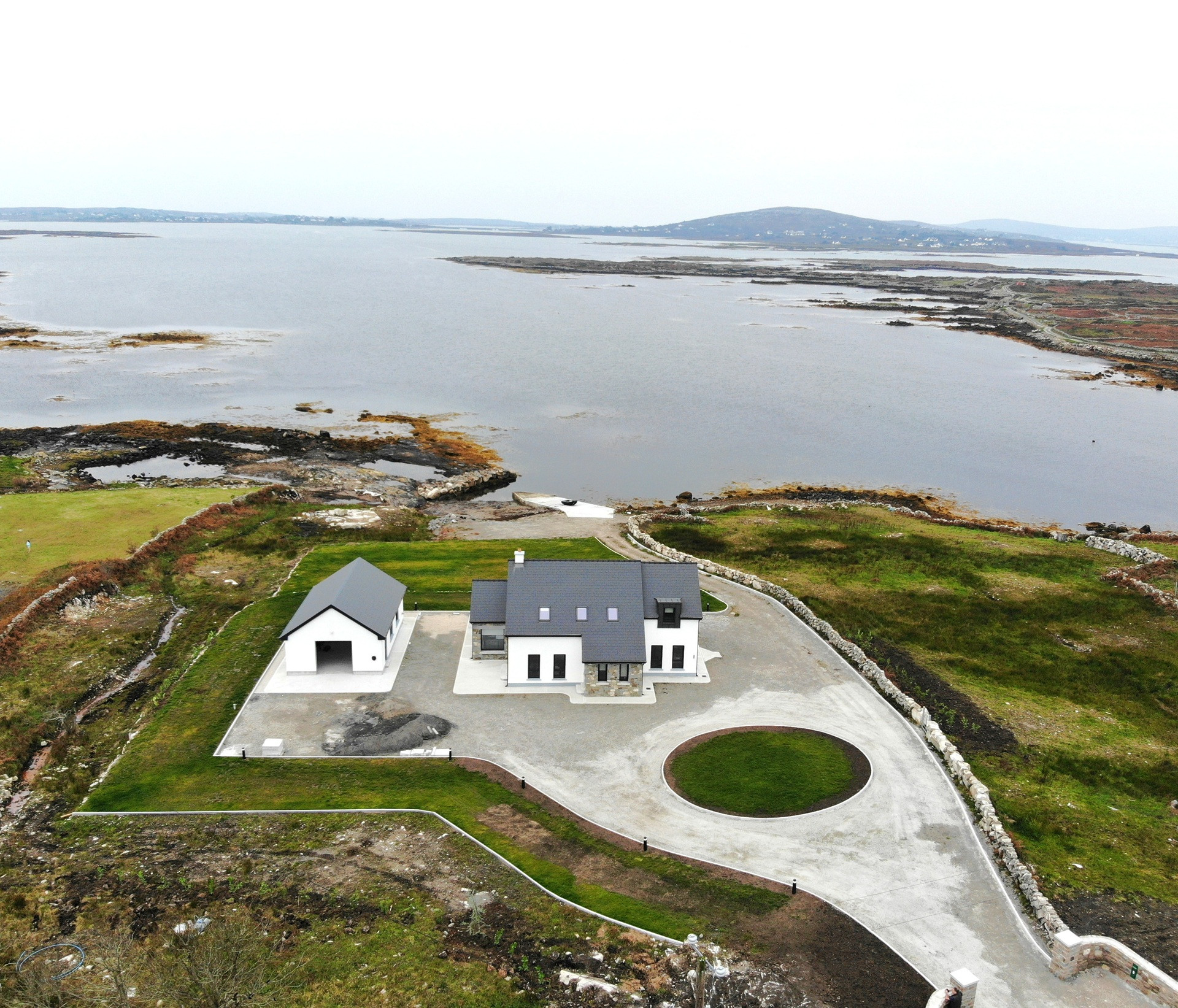 Perched above one of the most active boating piers on the Southern Connemara shores of Galway Bay, and only recently completed, this formidable home employs local materials and the most compelling masonry skills this side of Peru, to exploit its location to the utmost.