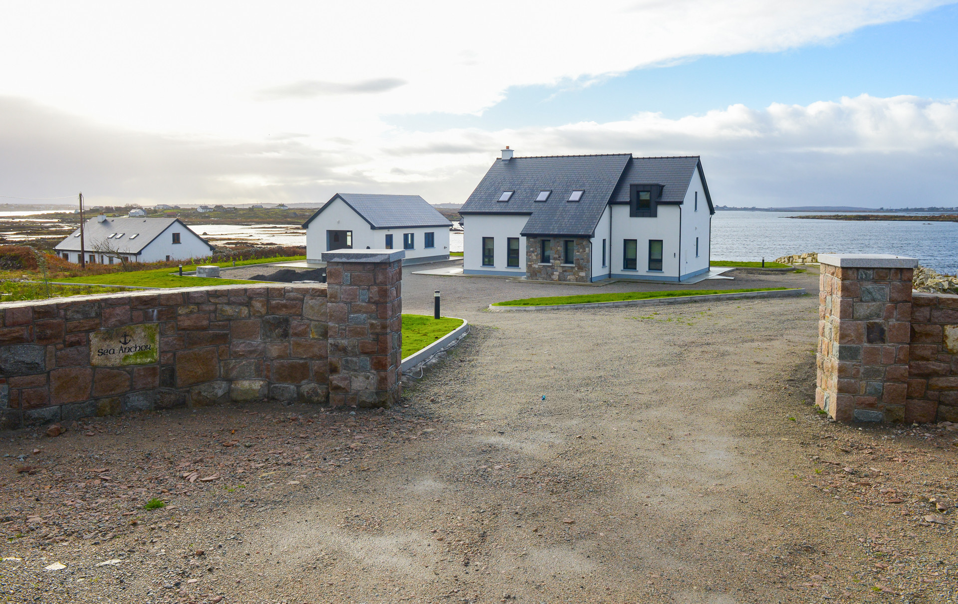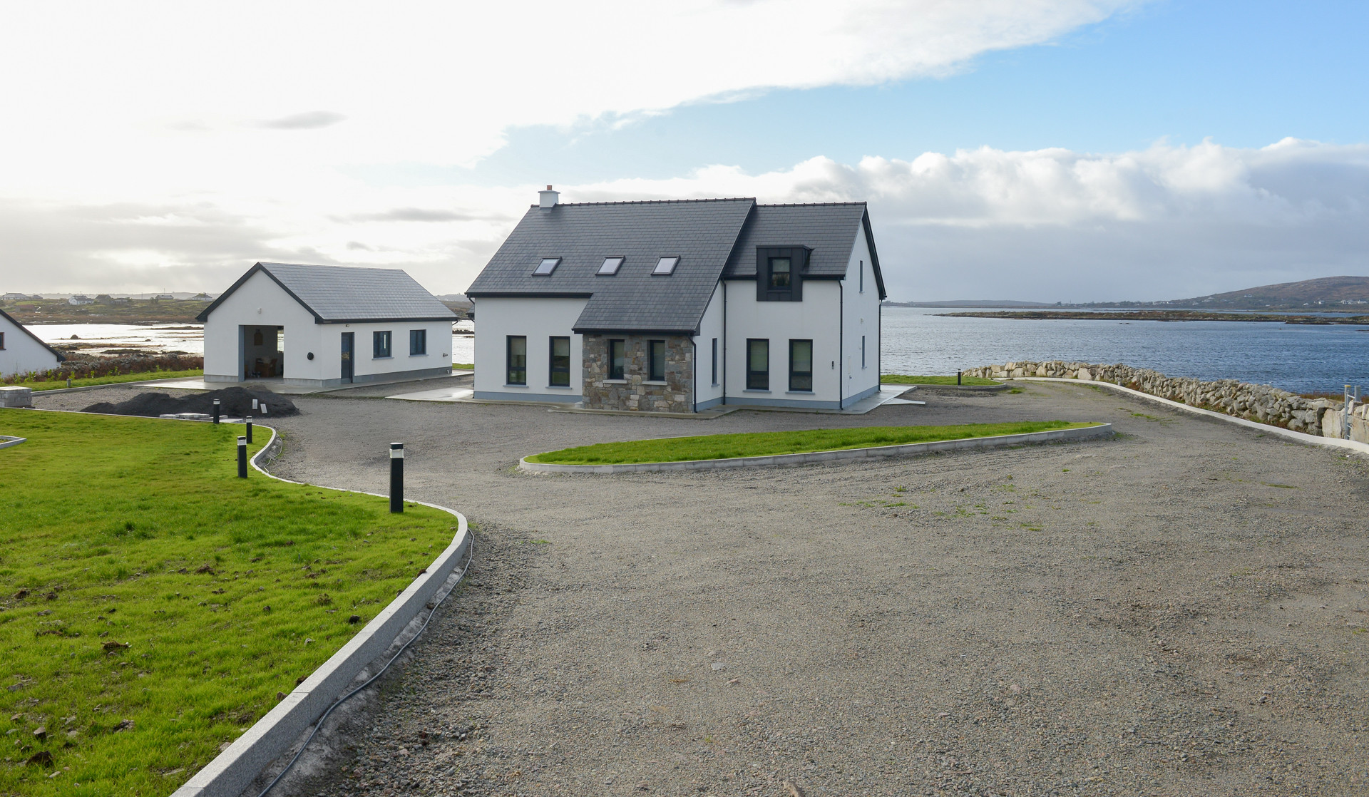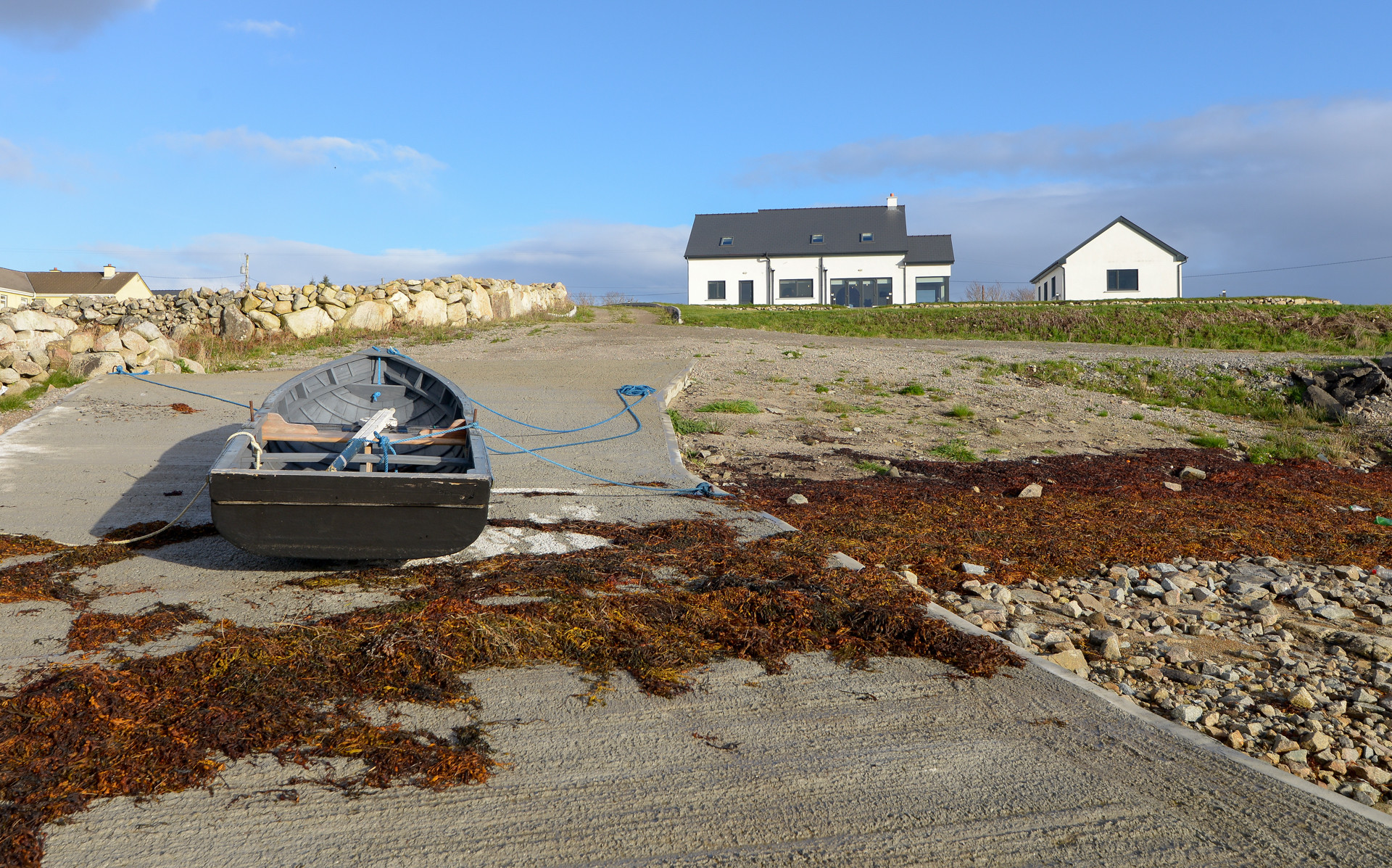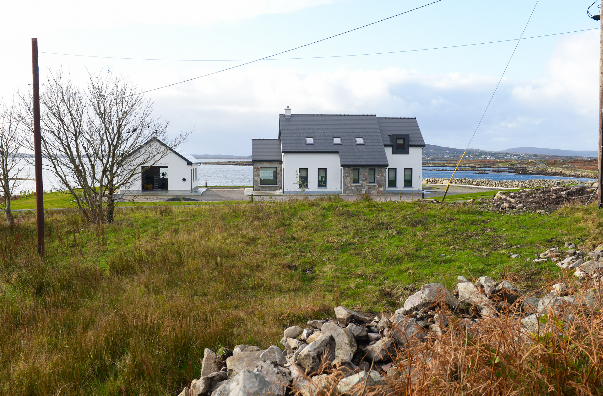 Perched above one of the most active boating piers on the Southern Connemara shores of Galway Bay, and only recently completed, this formidable home employs local materials and the most compelling masonry skills this side of Peru, to exploit its location to the utmost.
