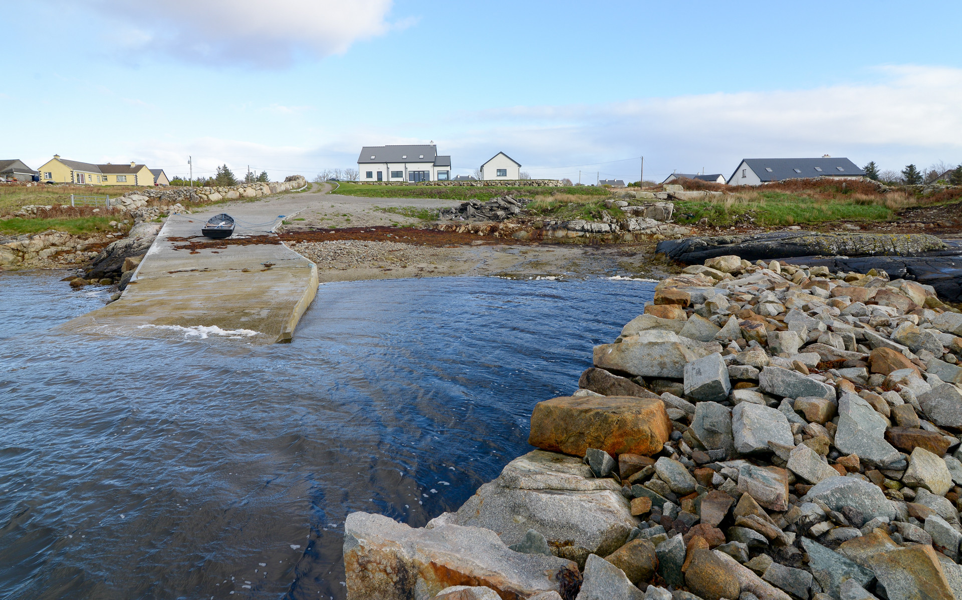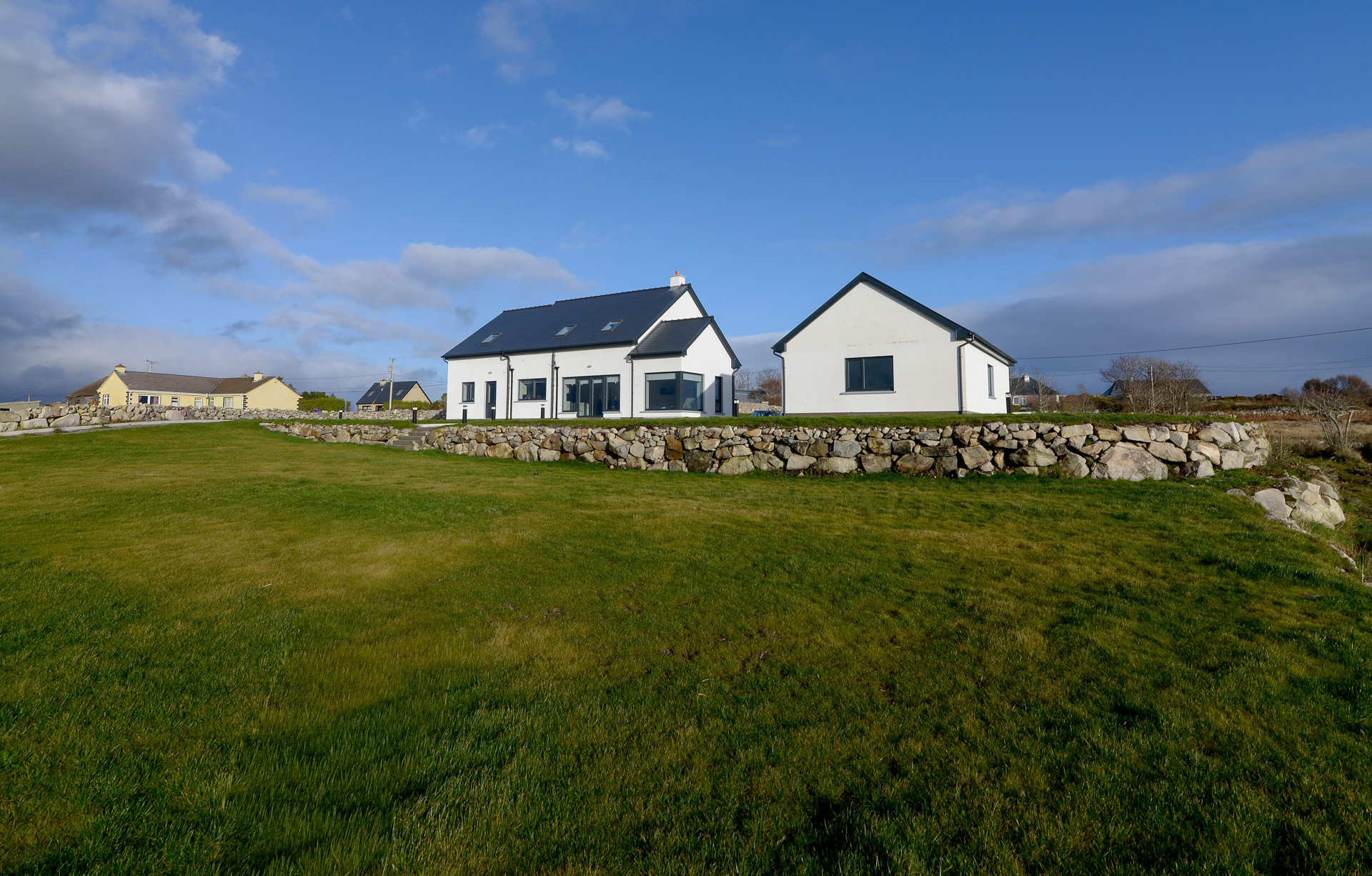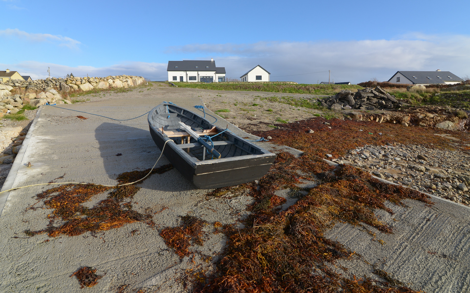 Perched above one of the most active boating piers on the Southern Connemara shores of Galway Bay, and only recently completed, this formidable home employs local materials and the most compelling masonry skills this side of Peru, to exploit its location to the utmost.