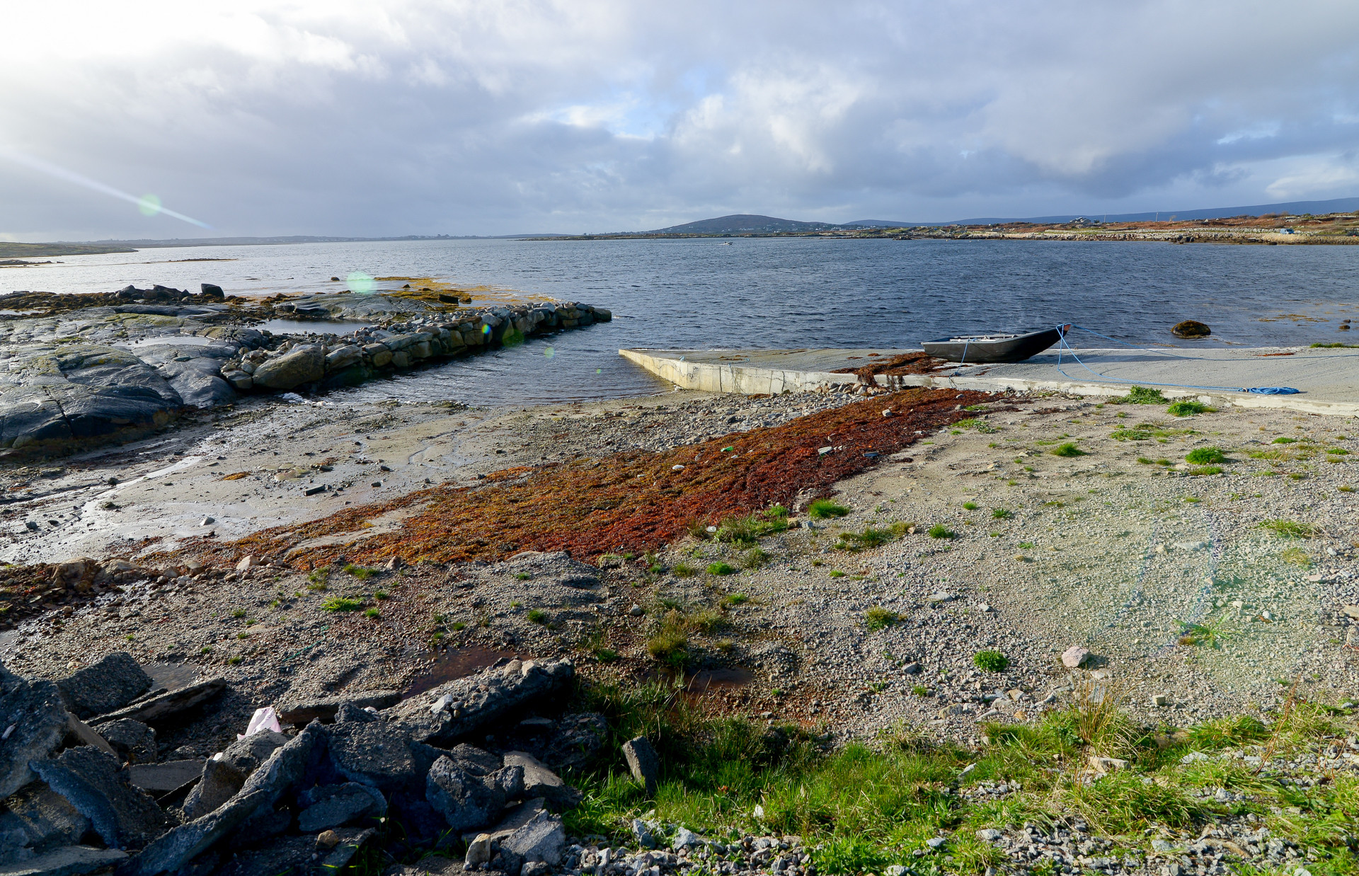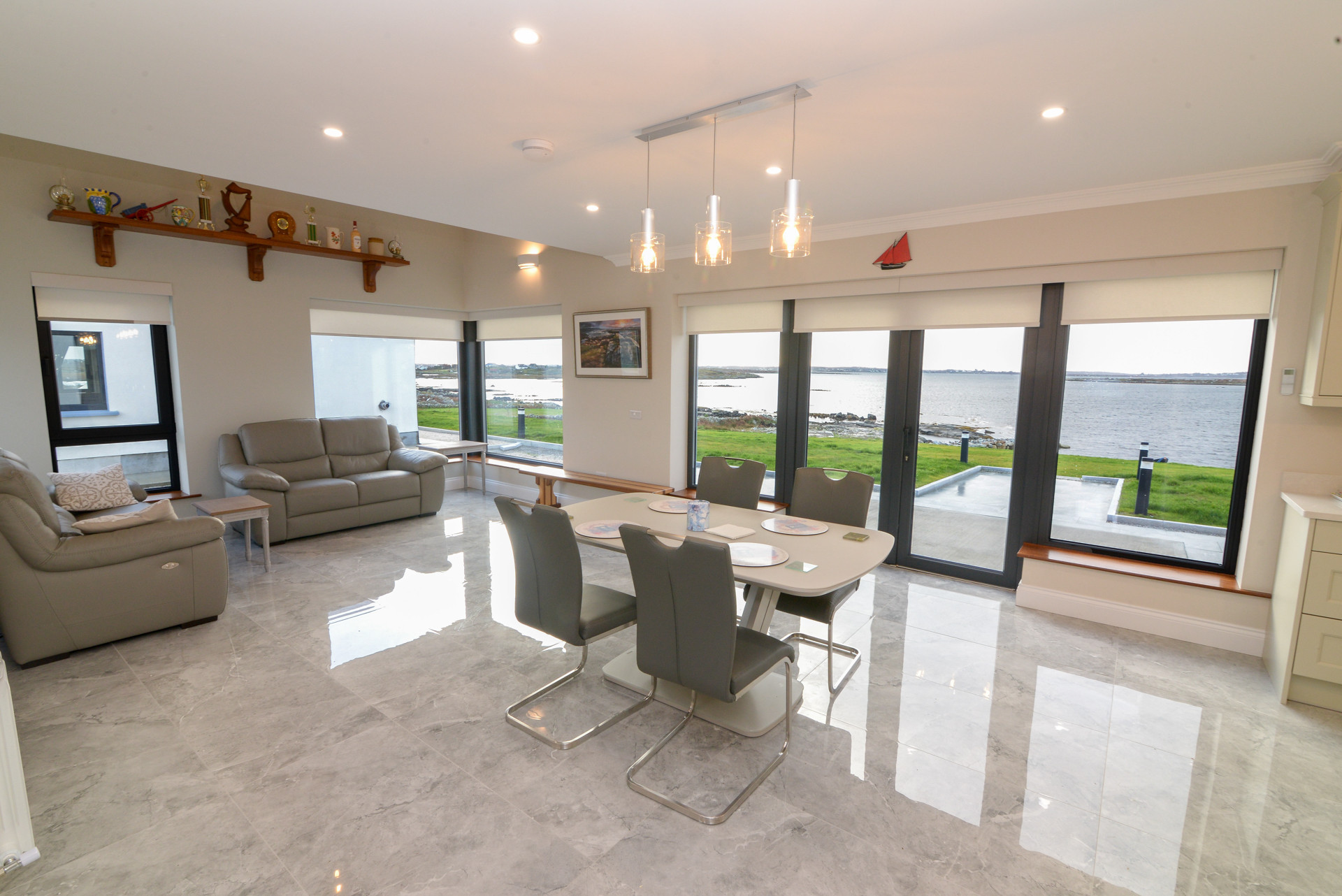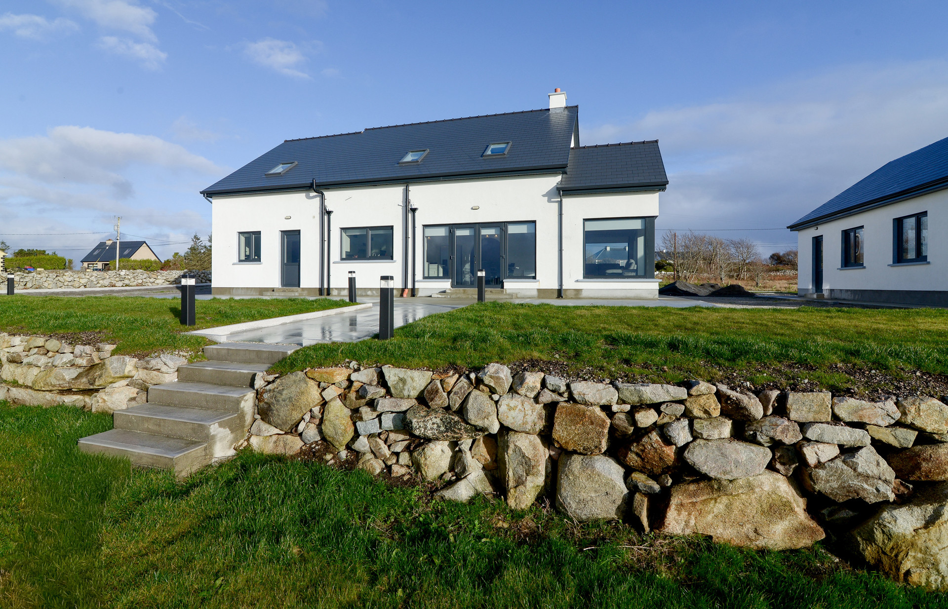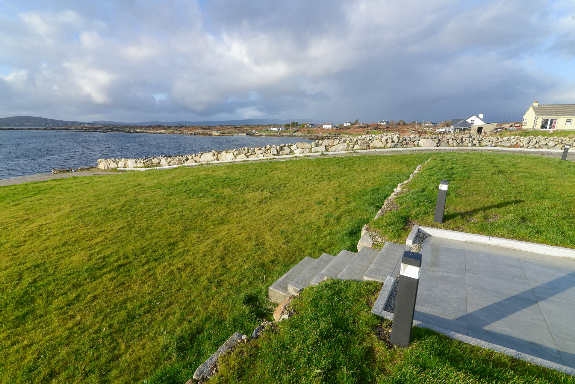 Perched above one of the most active boating piers on the Southern Connemara shores of Galway Bay, and only recently completed, this formidable home employs local materials and the most compelling masonry skills this side of Peru, to exploit its location to the utmost.