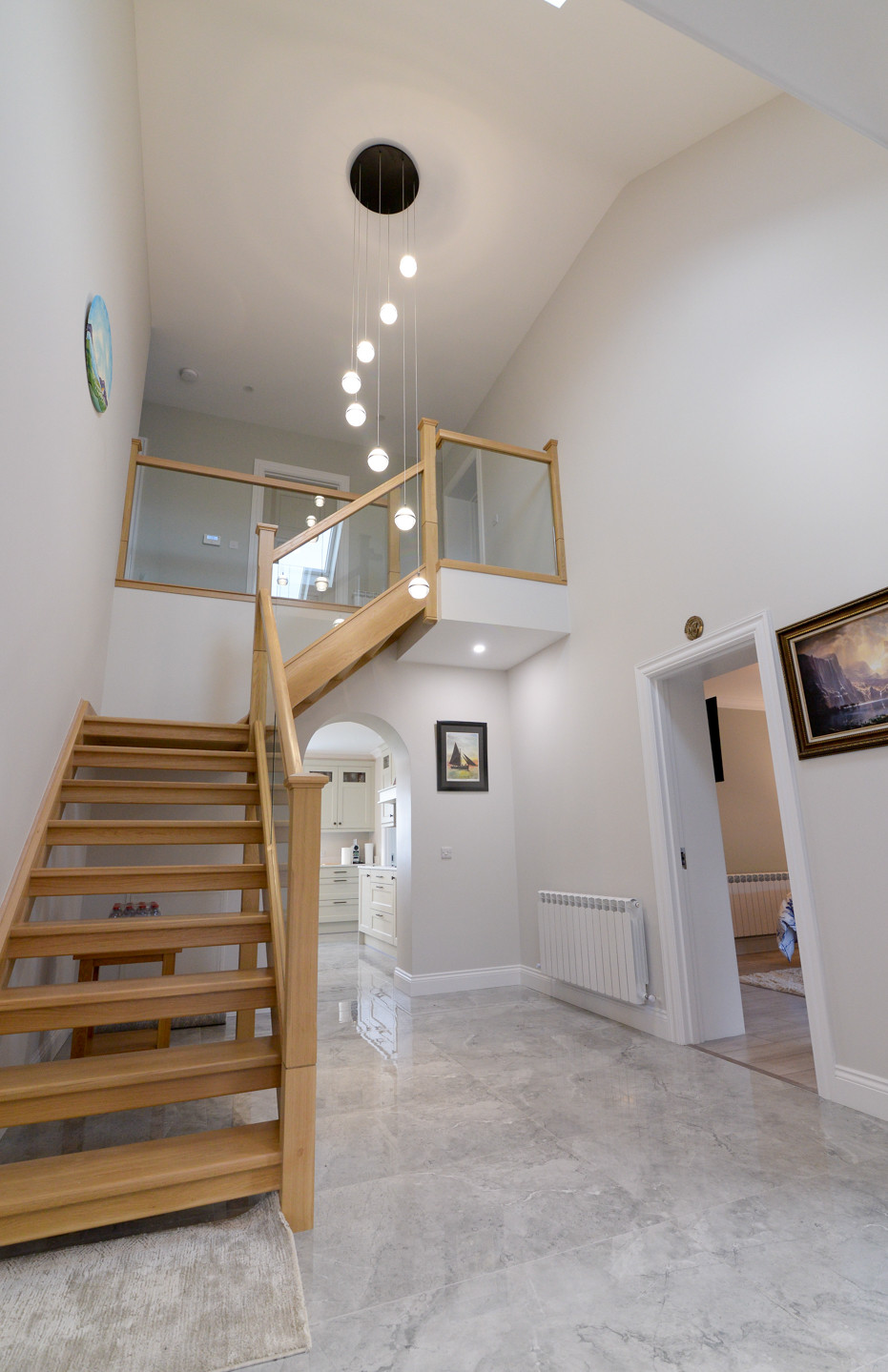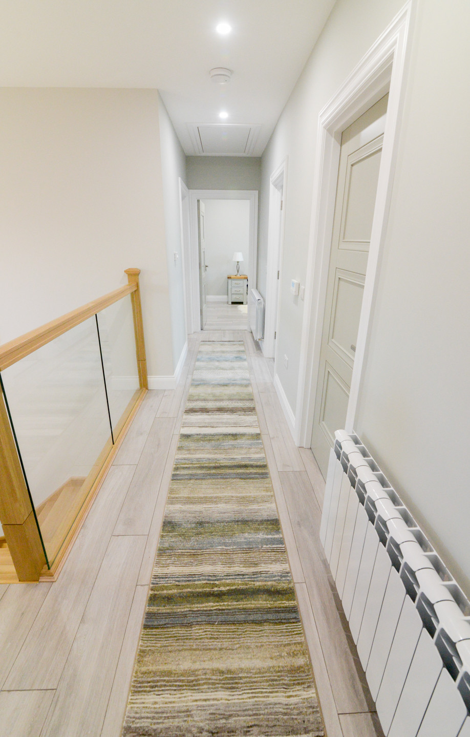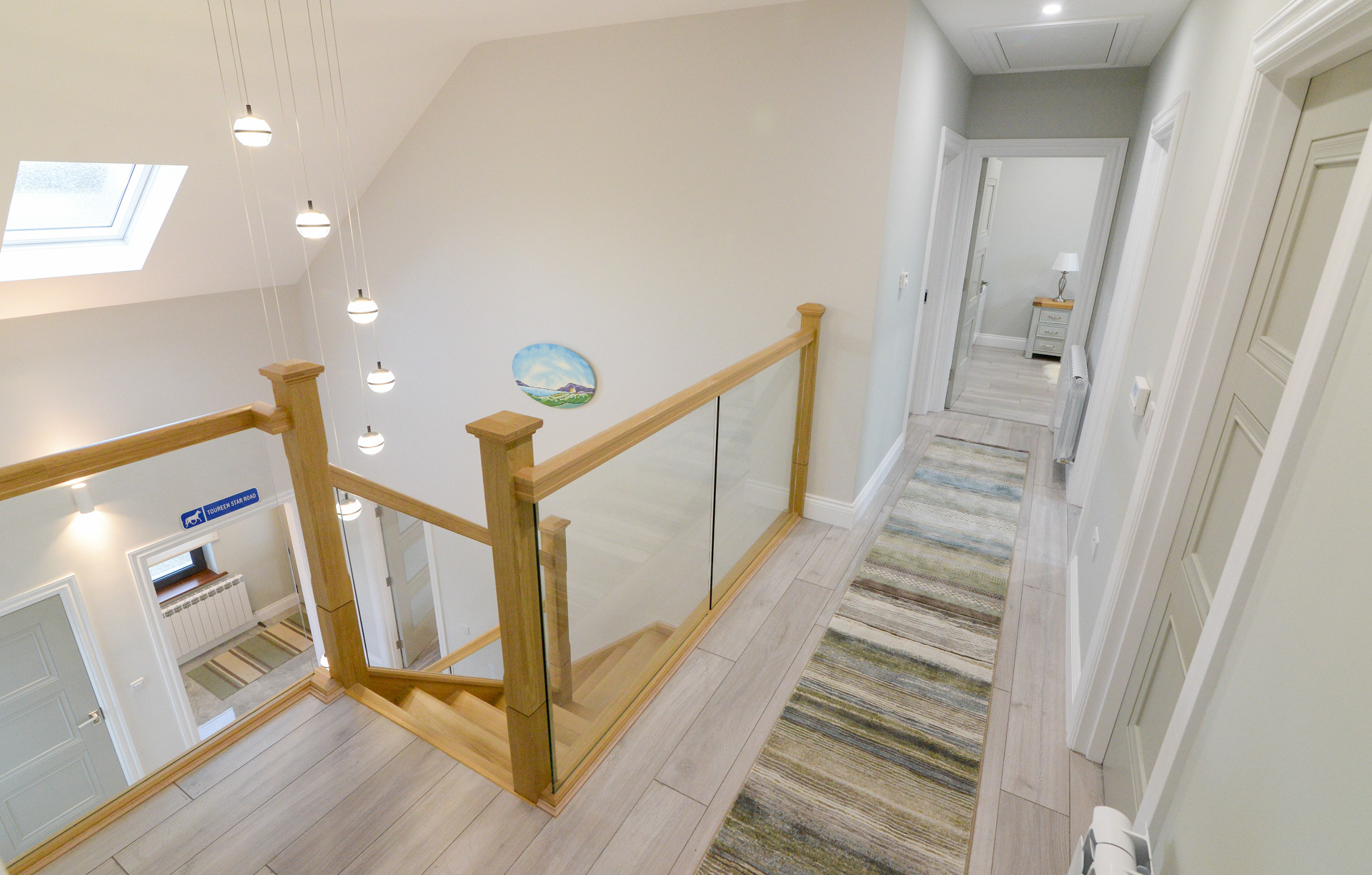 Oak return stairs at the corner of the house lead to bedroom accommodation on the lower ground floor, with hallways running in two directions.