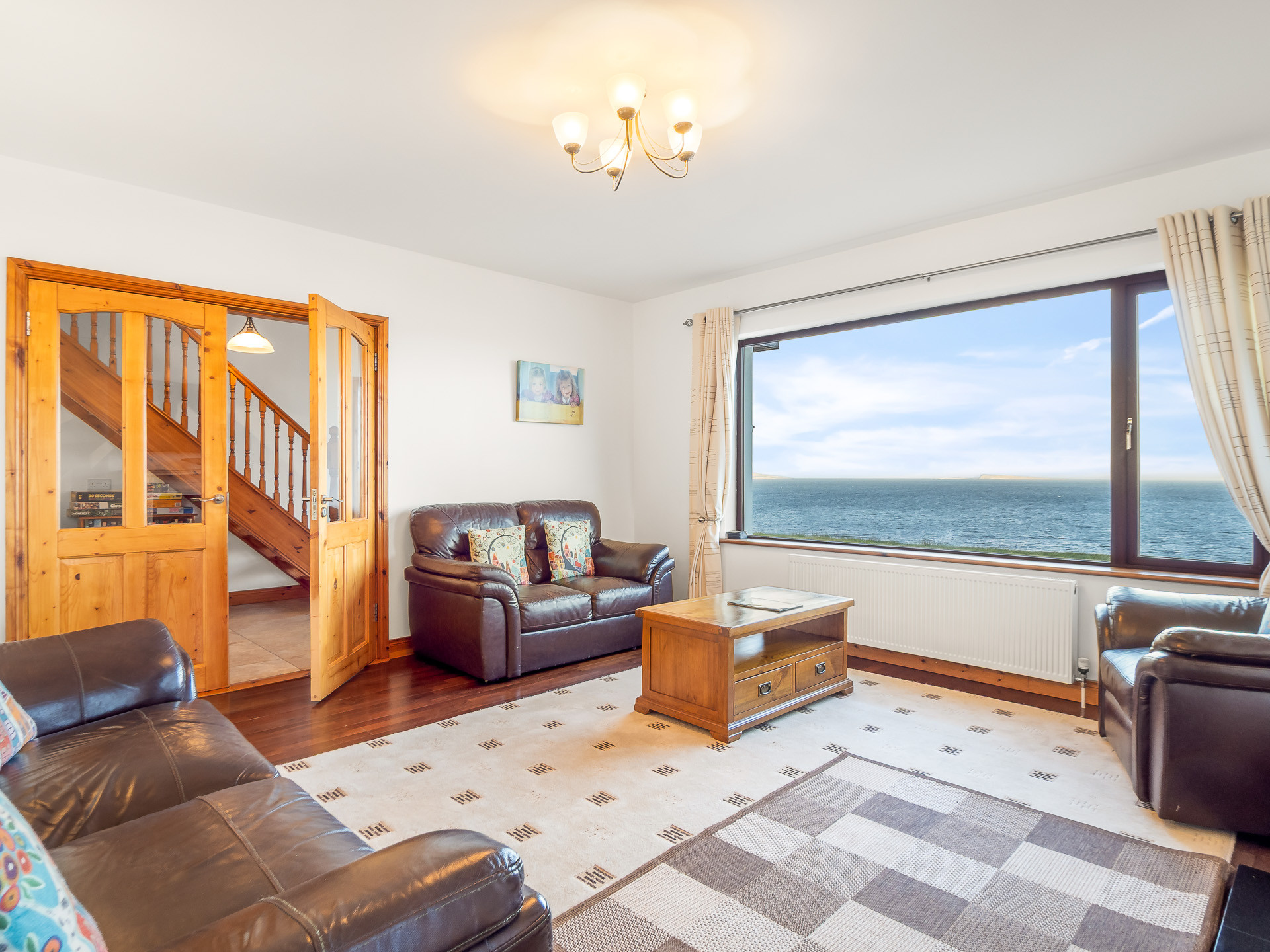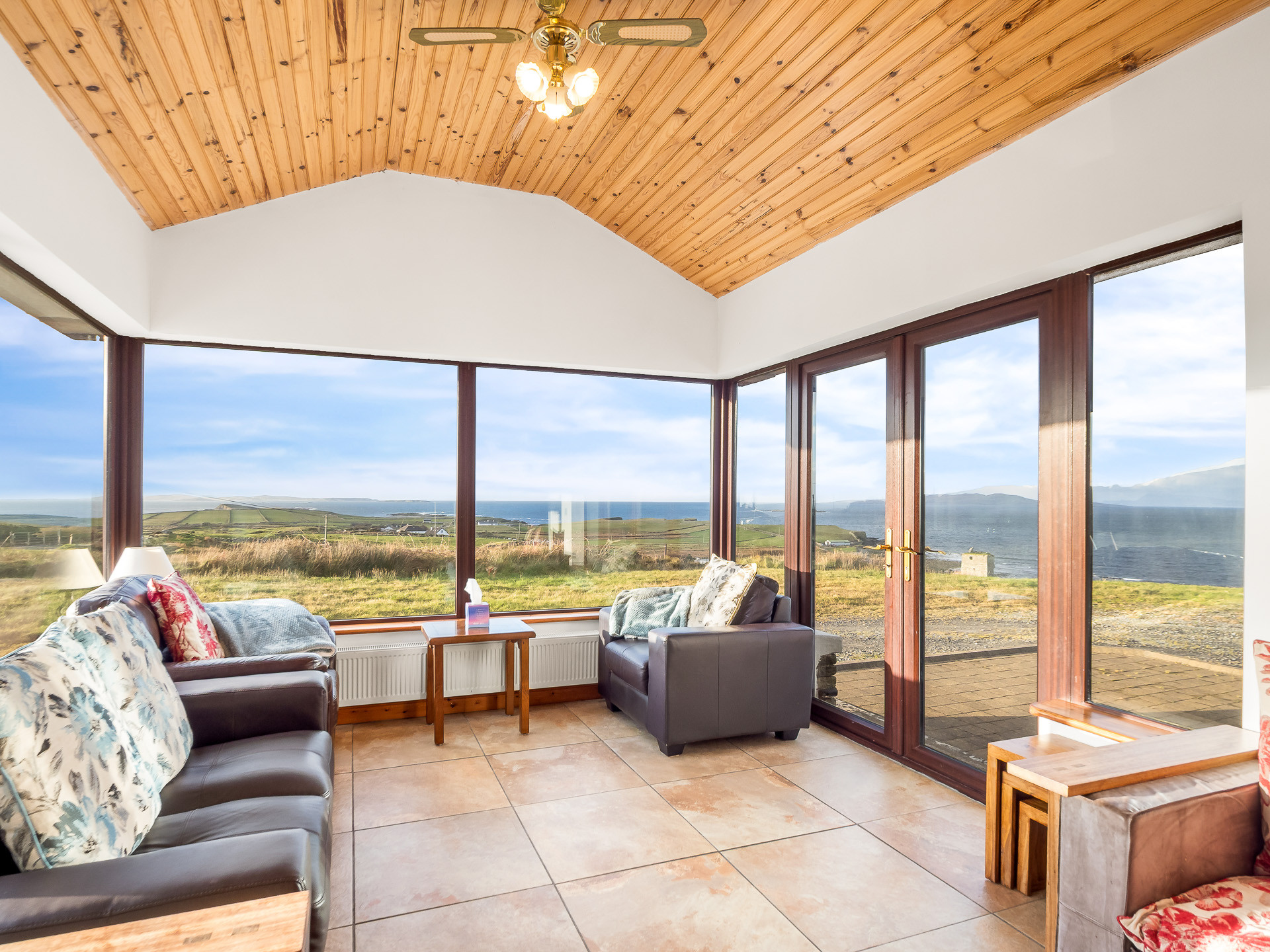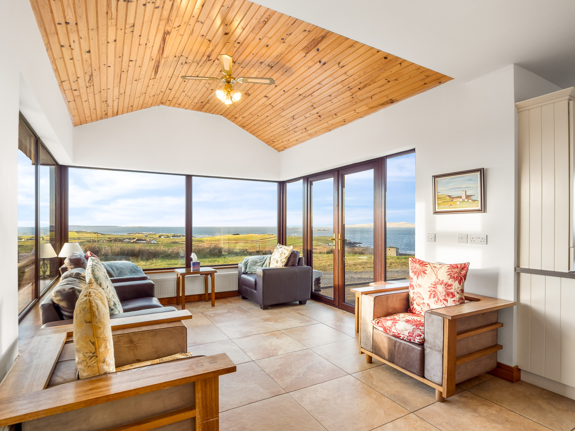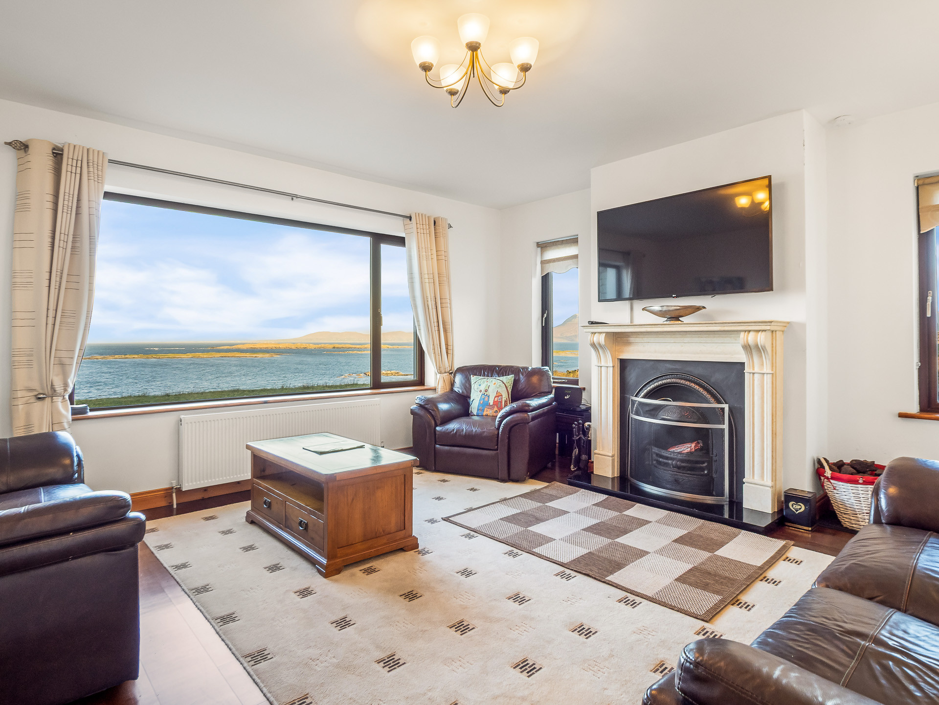 The sitting room has comfortable leather seating, an open solid fuel fireplace and a 55-inch flat screen Smart TV with Satellite and DVD... all making it the perfect place to sit back, unwind and admire the spectacular ocean scenery.