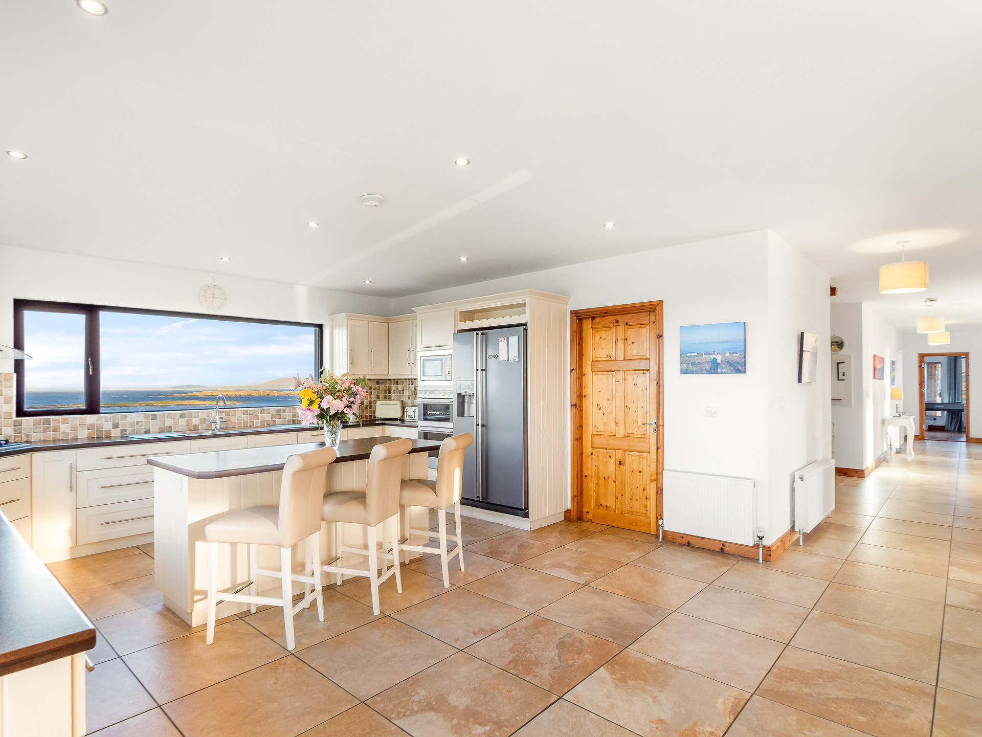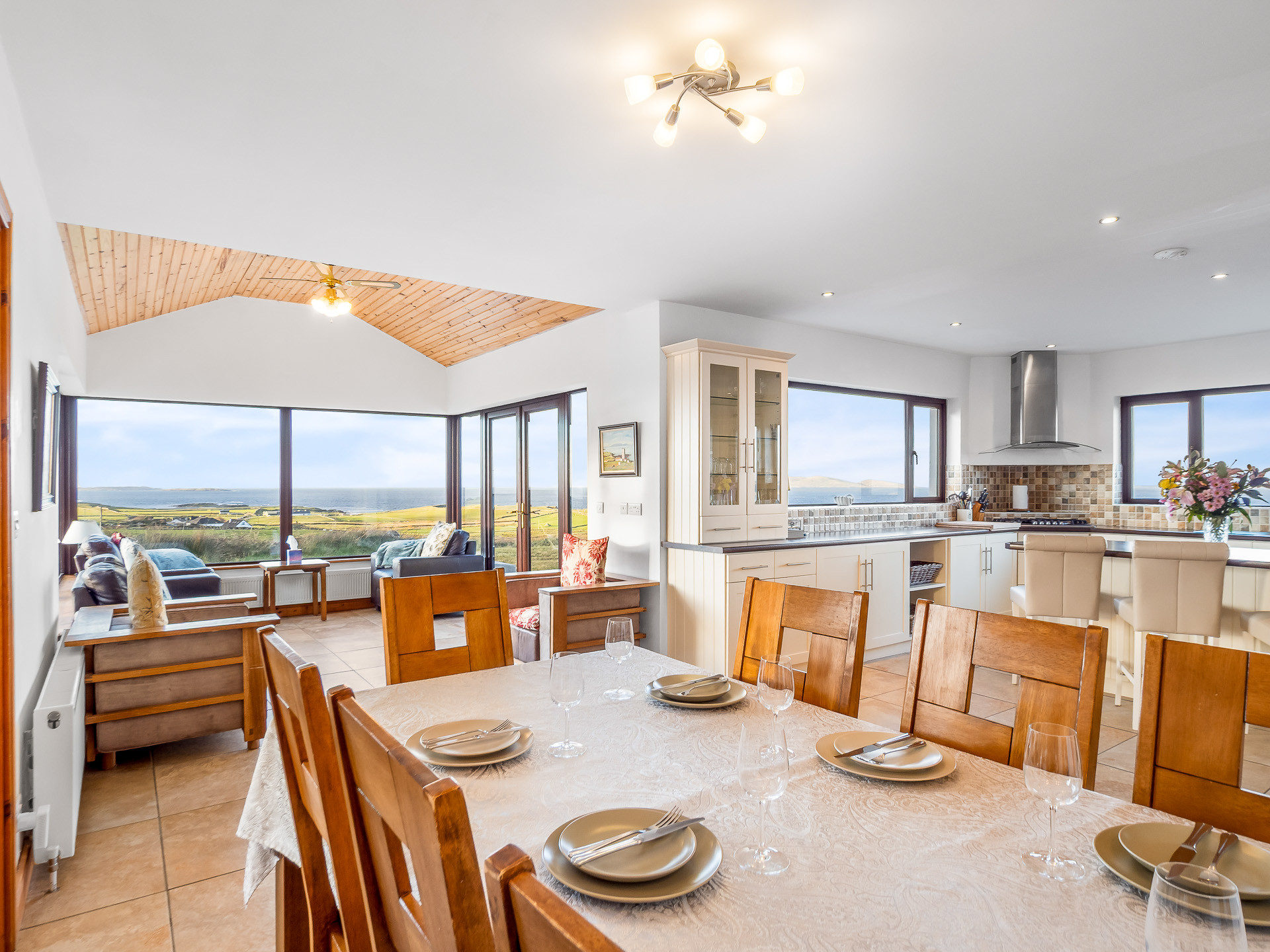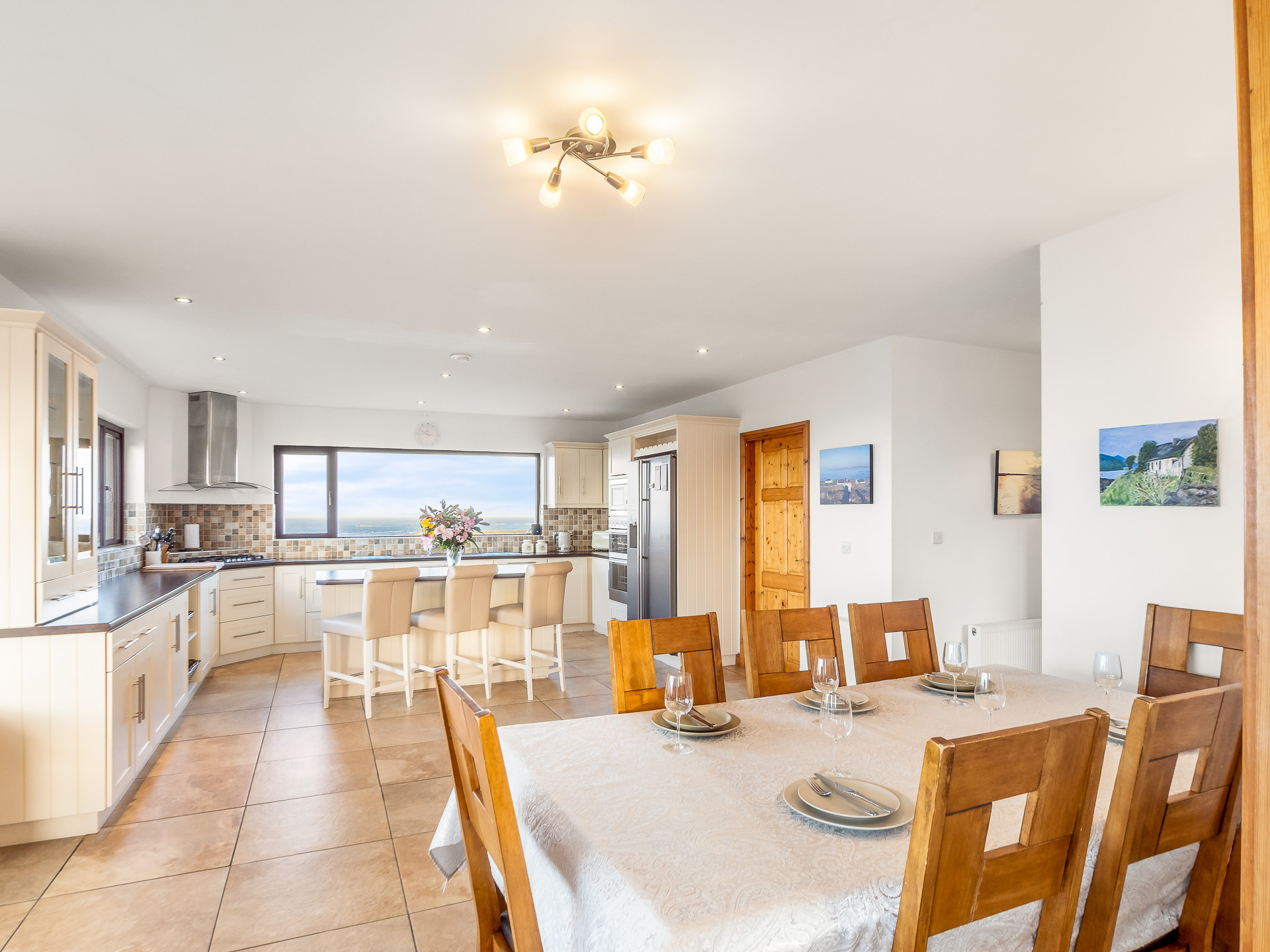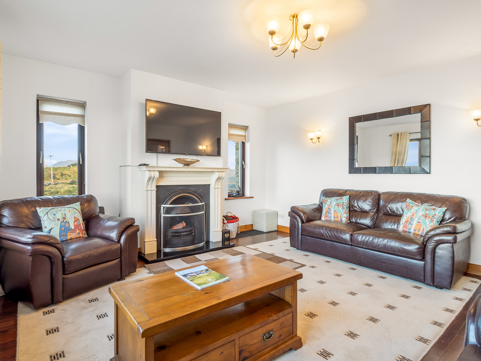 The sitting room has comfortable leather seating, an open solid fuel fireplace and a 55-inch flat screen Smart TV with Satellite and DVD... all making it the perfect place to sit back, unwind and admire the spectacular ocean scenery.