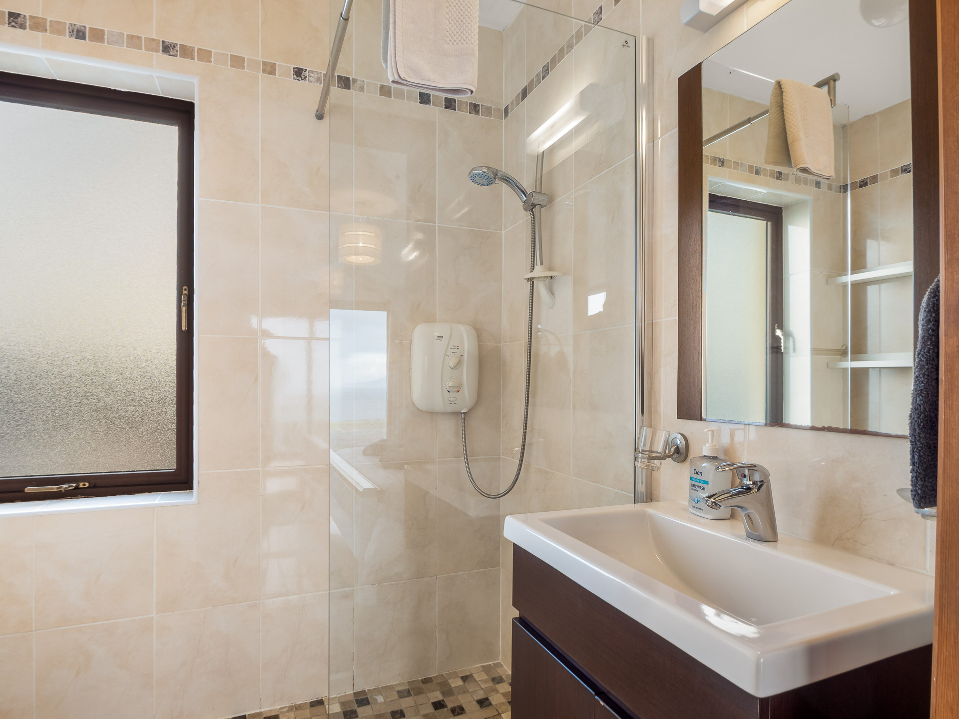 Shower room with electric shower, WC and sink unit and a separate WC.
