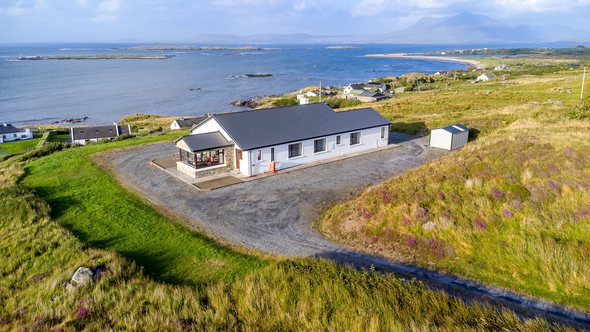 Tarmac drive with well-maintained garden. Picnic bench perfect for dining alfresco and taking in the gorgeous bay and mountain views. Shed can be used by guests for storage if requested