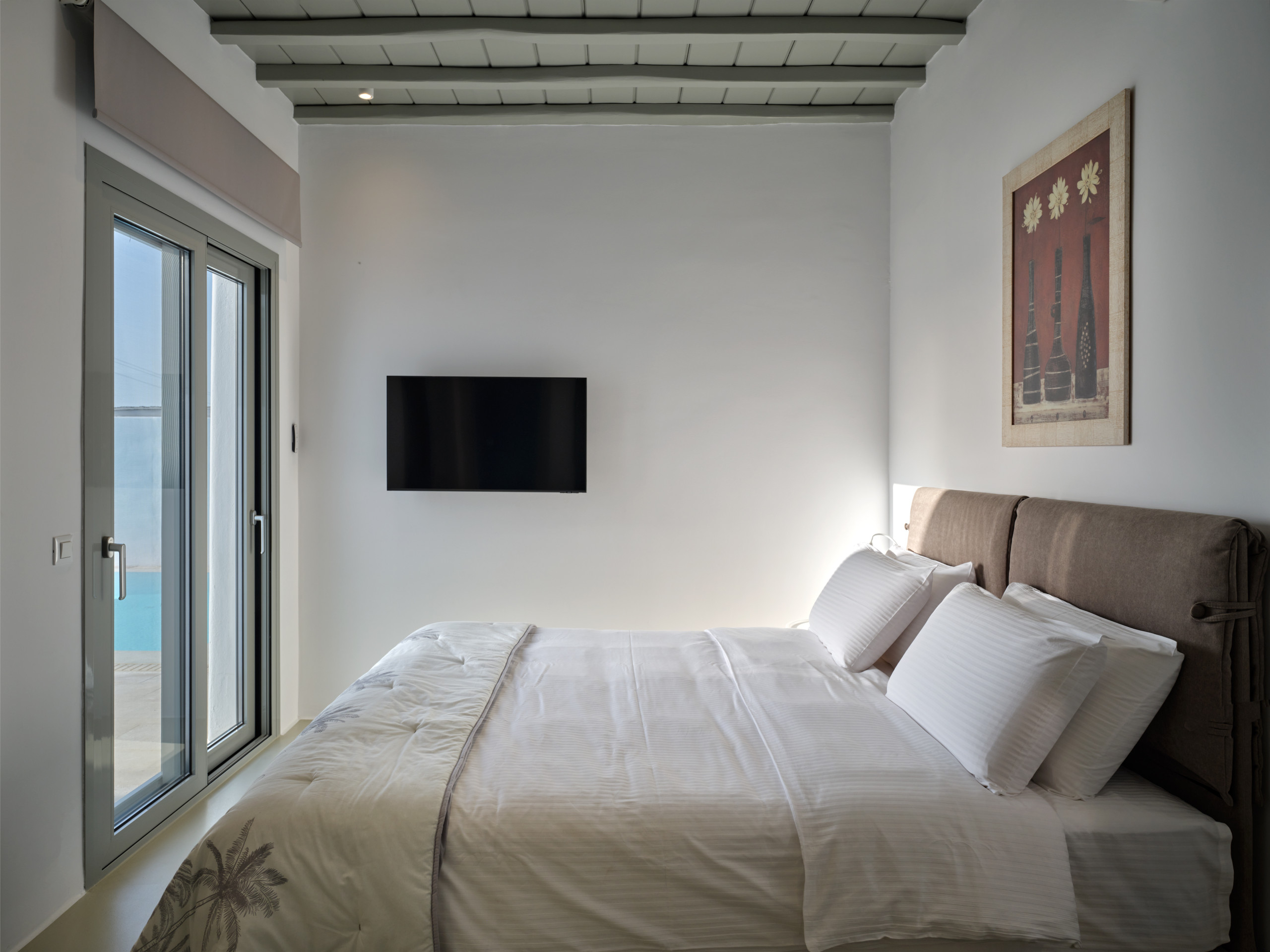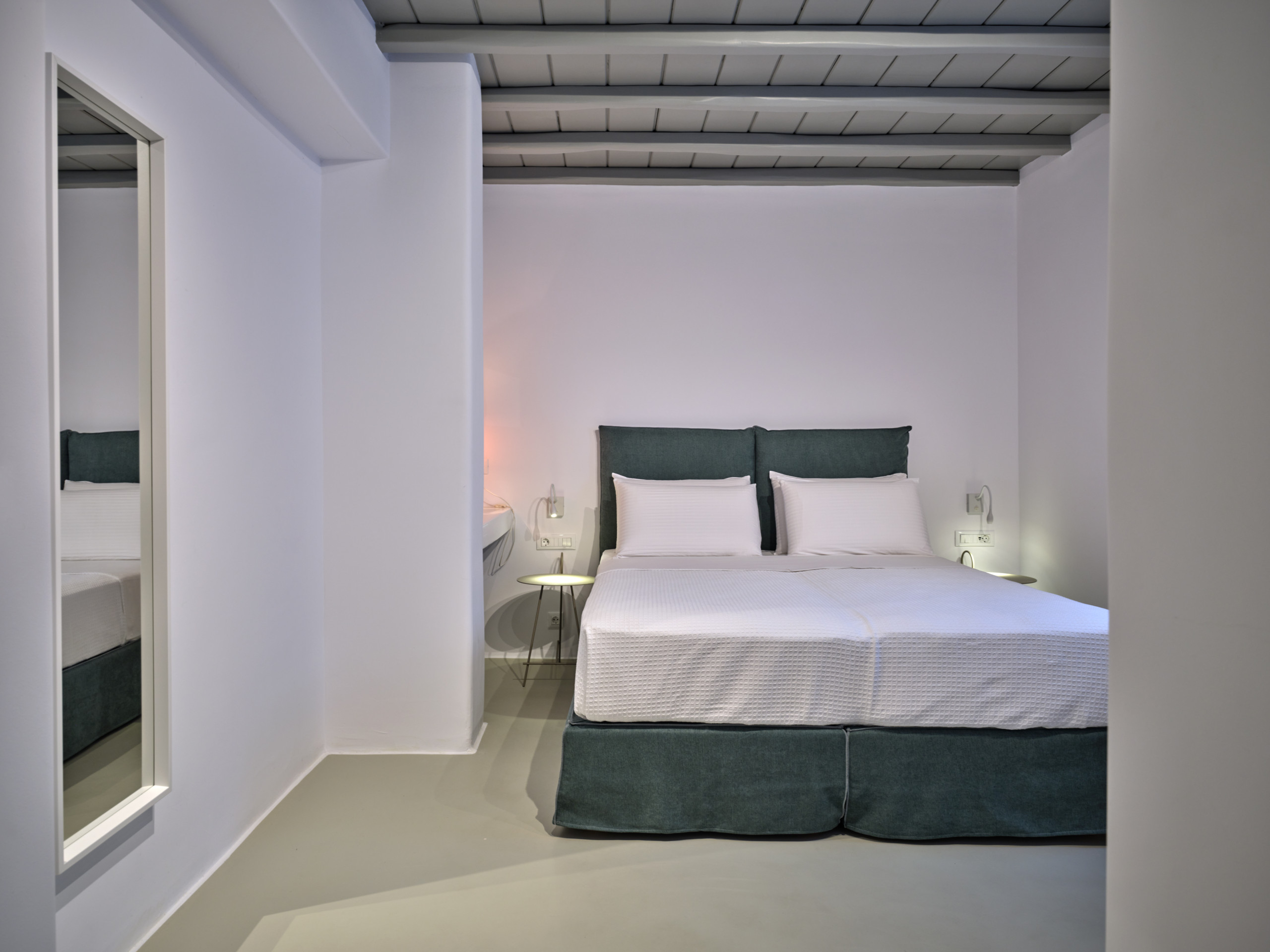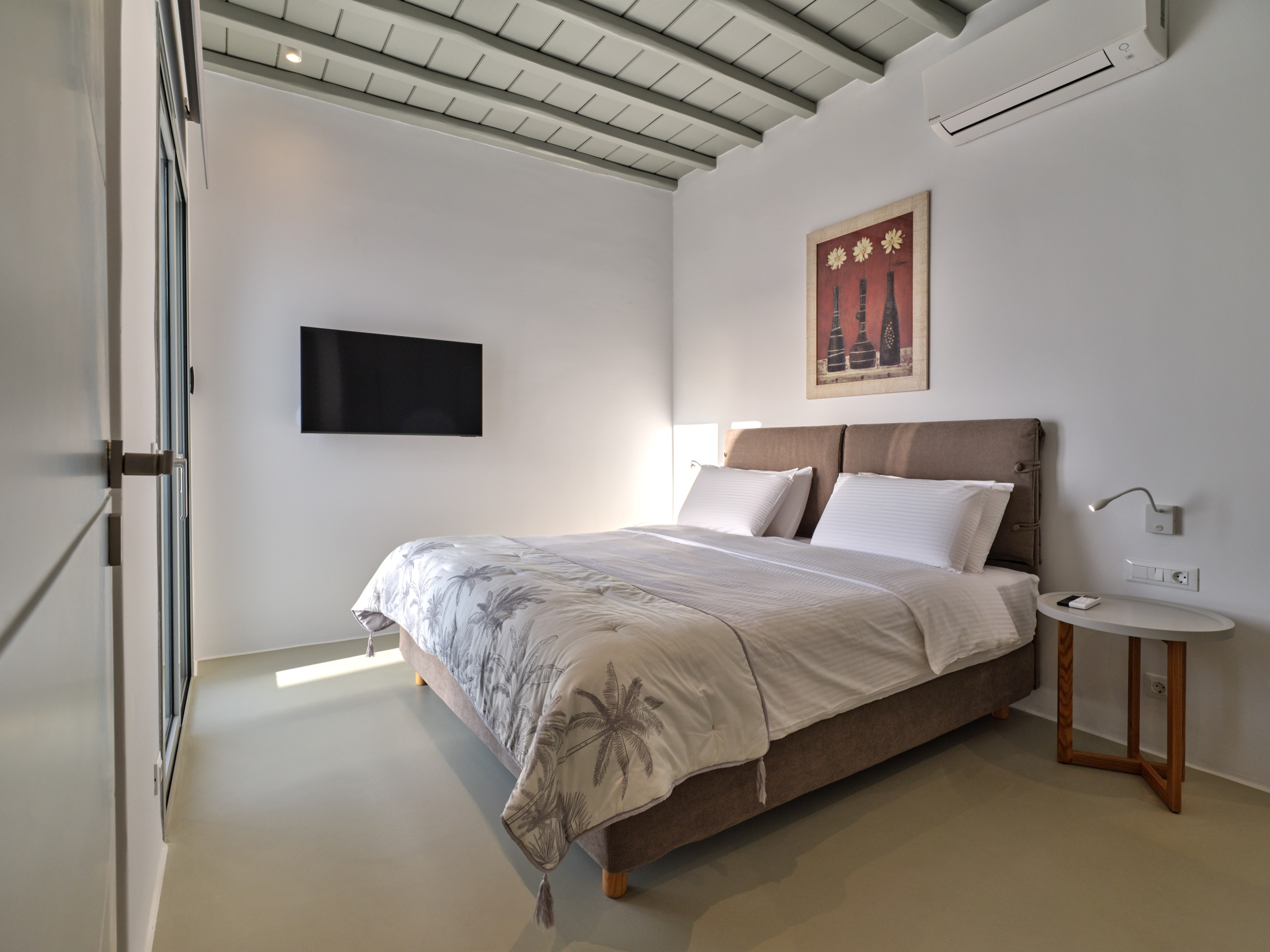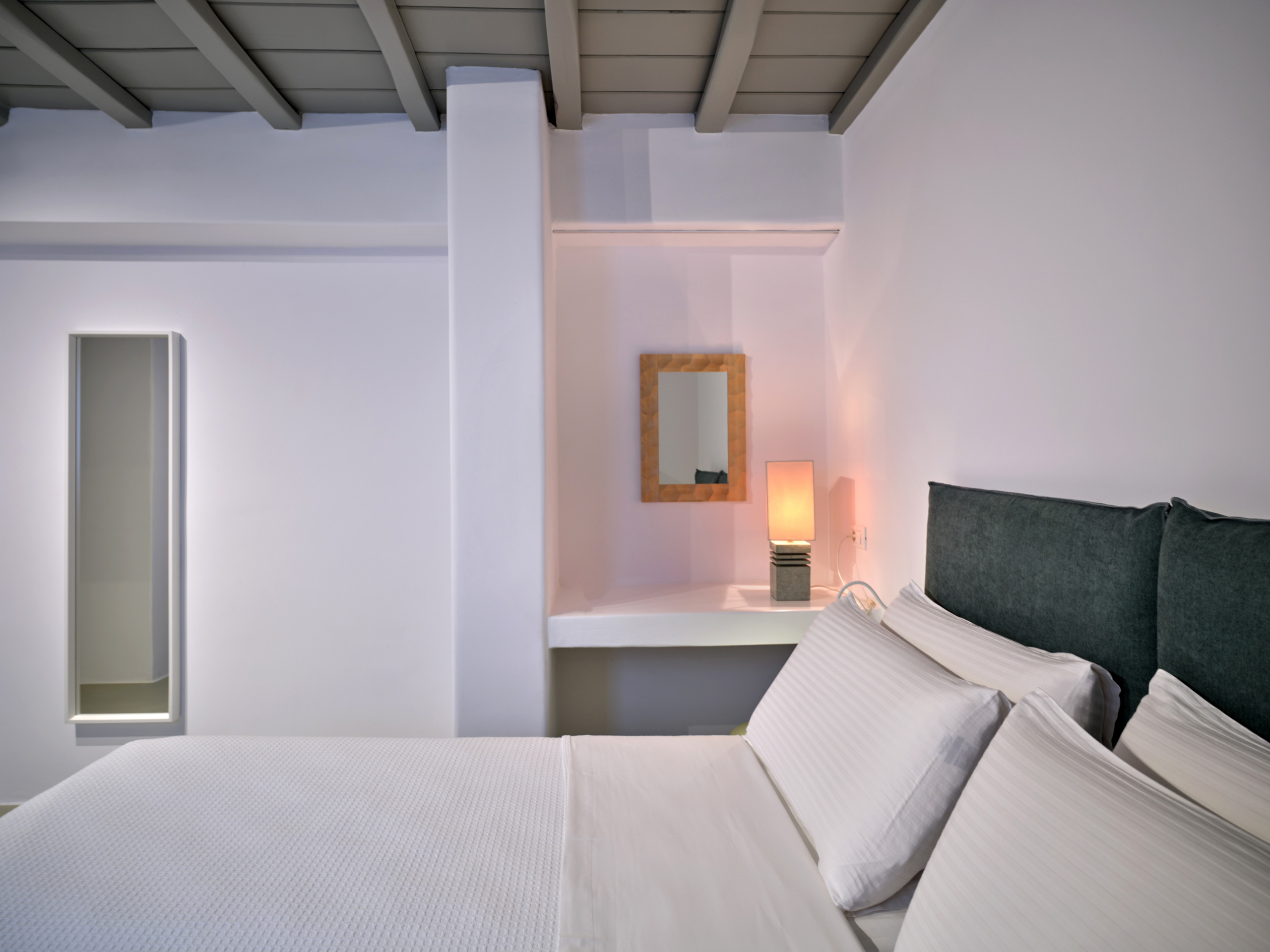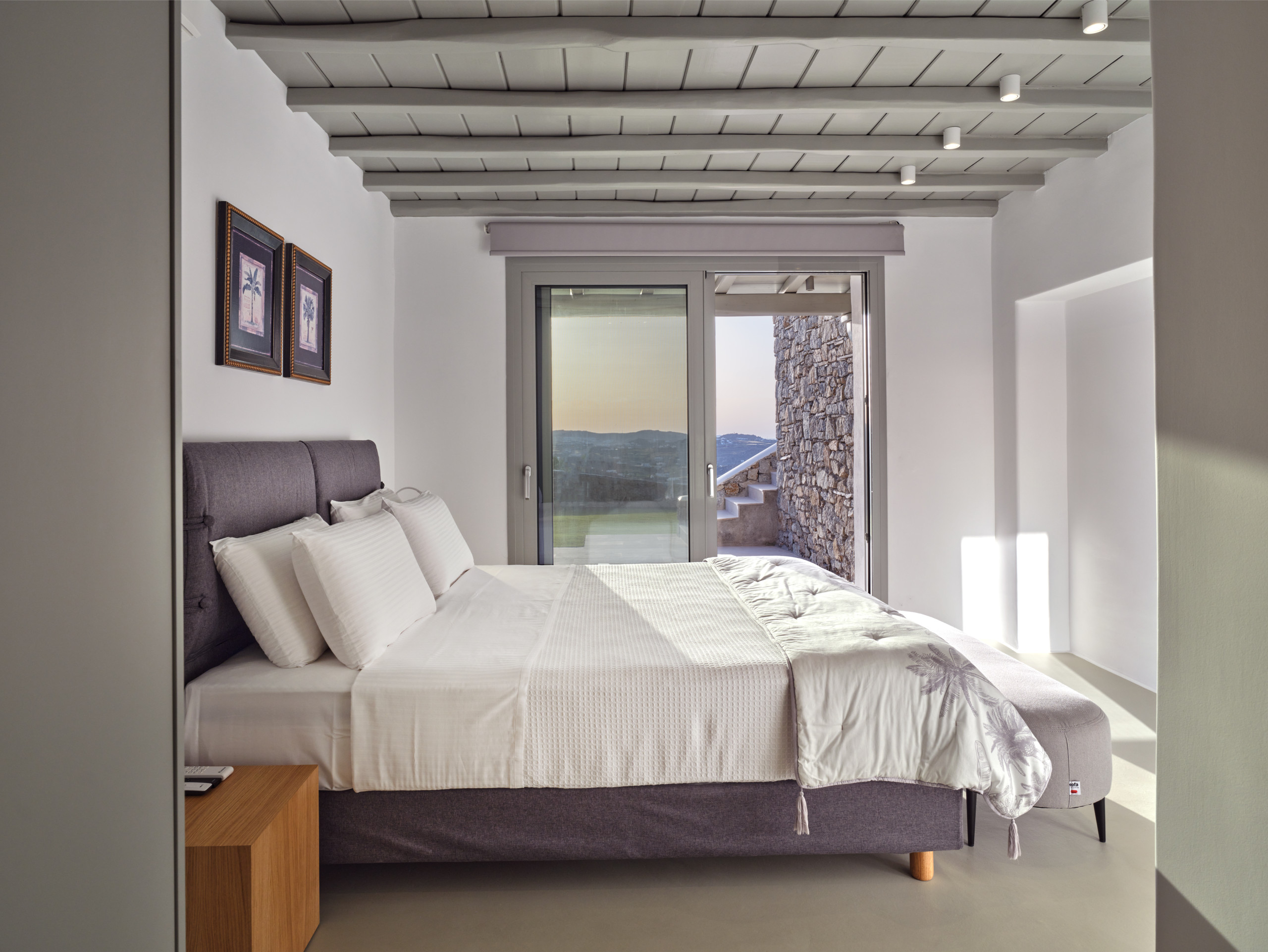 Wake up to the whispers of the Aegean breeze, greeted by panoramic views of the Mykonian landscape and the boundless Aegean blue.