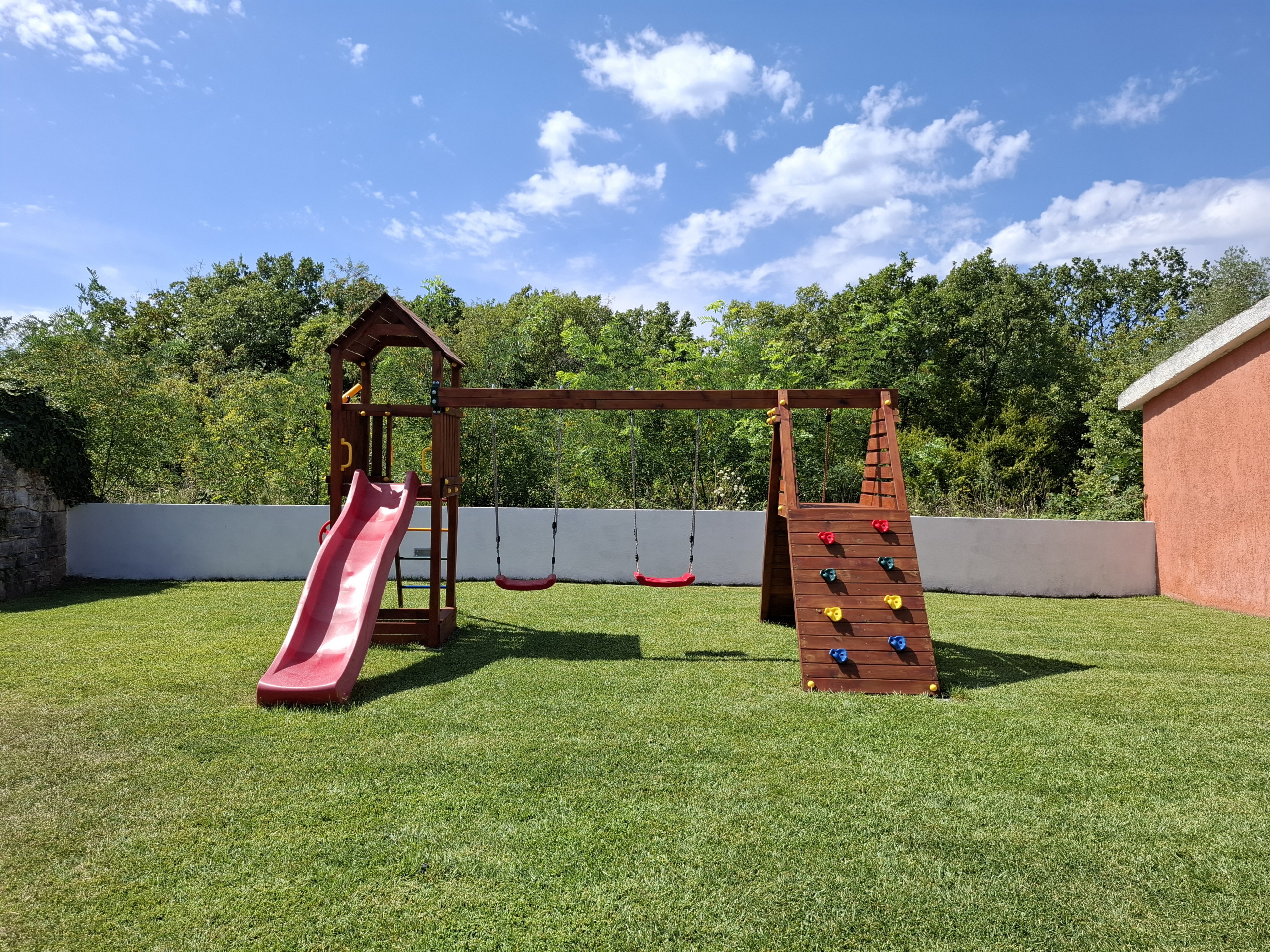 Villa Prisedi, features extremely nice rustic interior and exterior design. Guests can enjoy many additional contents, such as an: outdoor swimming pool, outdoor heated shower, entertainment room with table soccer, darts, PS4 console, fireplace grill on a roofed terrace, free Wi-fi, air-conditioning and free parking for three vehicles. Children's swing and climber are located in the garden.